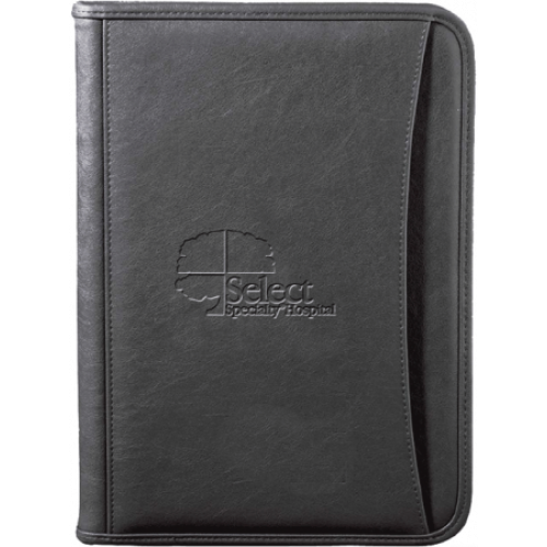 Zippered closure. Interior organizer with gusseted file pocket. Clear ID or calculator pocket. Front slot pocket. Includes 8.5” x 11” writing pad.