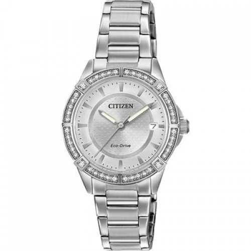 ~~Share your fashionable point of view starting with the hip Drive from Citizen POV model with a Swarovski crystal adorned bezel. Featured in stainless steel case with multi-link bracelet, silver dial and date.